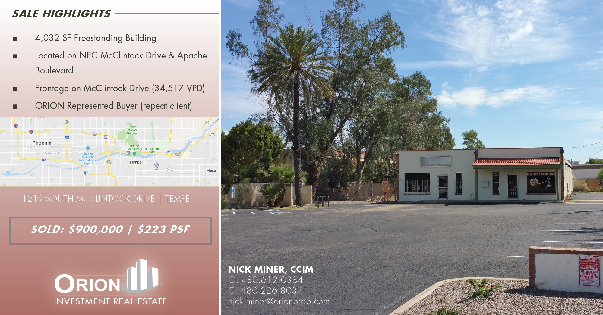 TEMPE – Situated on the northeast corner of McClintock Drive and Apache Boulevard, the 4,032 square foot, freestanding building closed for $900,000, or $223 per square foot. Situated on 41,948 square feet of land, the property has excellent frontage along McClintock Drive, which has over 34,500 vehicles passing per day. Sitting adjacent to a light rail stop makes for easy transportation to and from Downtown Tempe, Mill Avenue, Arizona State University’s Main Campus, and other several other Tempe amenities. The site is approximately one mile from Loop 101 (Pima) and Loop 202 (Red Mountain) freeways, which is where several new office developments have been constructed in the past year by Boyer, as well where Tempe Marketplace (a 1.2 million square foot open-air mall) is located.