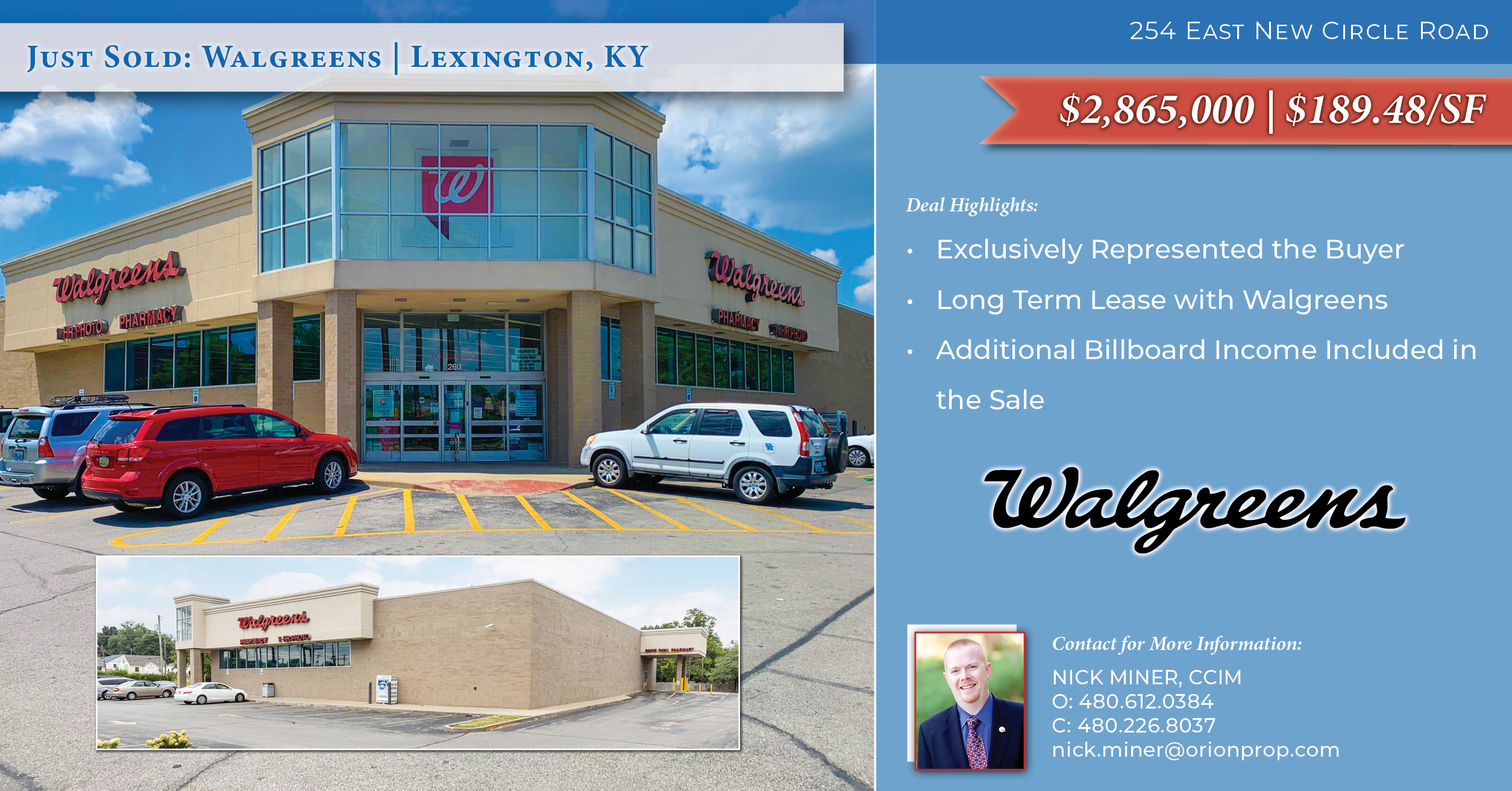Lexington, KY – Nick Miner, CCIM of ORION Investment Real Estate reports selling a long-term net-leased Walgreens property spanning 15,120 square feet. The property sold for $2,865,000 or $189.48 per square foot, at a healthy 7.1% cap rate. Miner represented the Buyer in the transaction, his long-time client Stuck Living Trust. The Seller, DBR Holdings LLC, was self-represented.