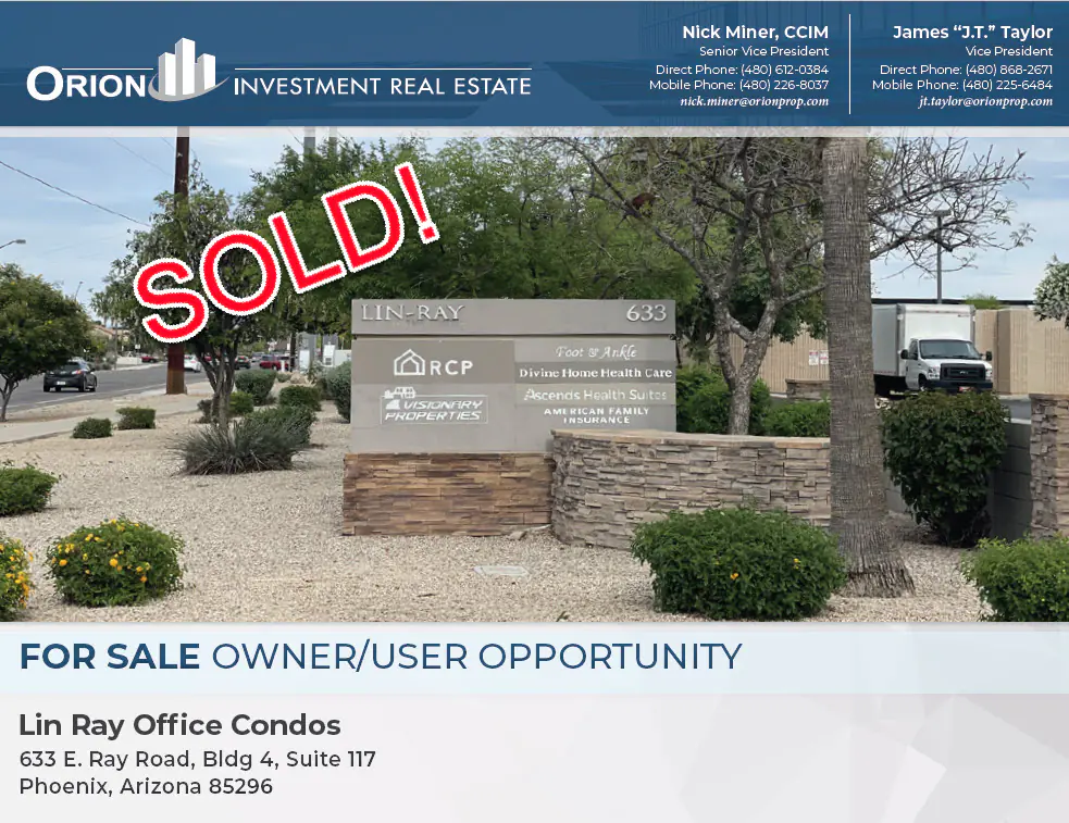 GILBERT, AZ – December 20, 2024 – Nick Miner, CCIM and JT Taylor of Orion Investment Real Estate represented BDW Land Investments, LLC, in the successful disposition of a well-located office condo at 633 E Ray Road in Gilbert, Arizona which is part of the Lin-Ray Professional Condominiums. The transaction, valued at $403,000.00, or $331 per square foot, shows the continued strength of the owner user office markets in the Valley.