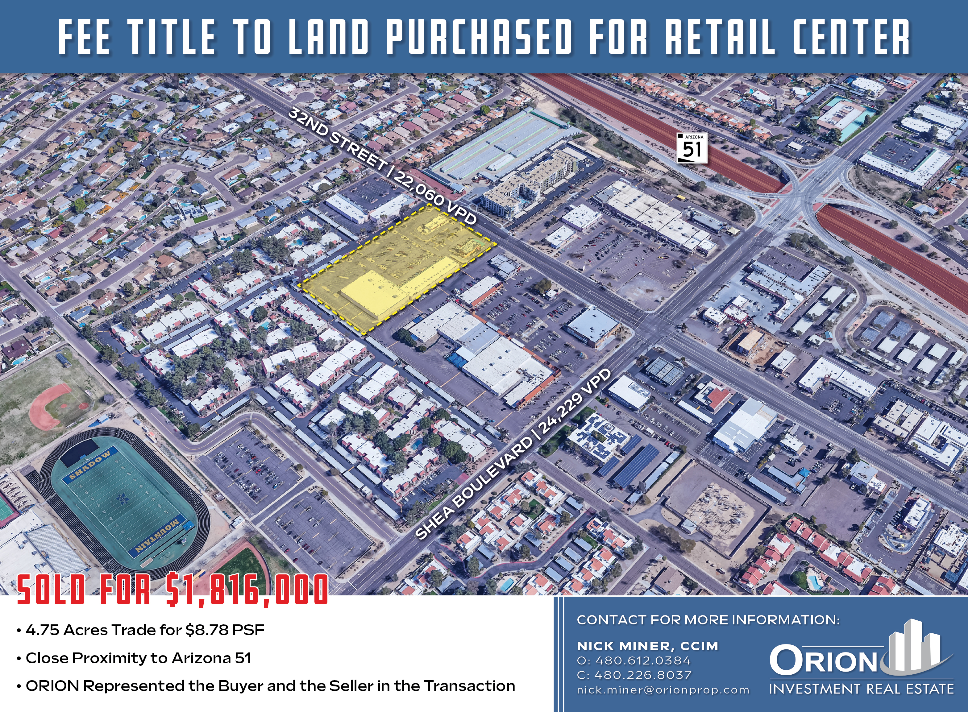 PHOENIX, AZ – Nick Miner, CCIM of ORION Investment Real Estate and Sean Bishop, CCIM of Lee & Associates, reports representing the buyer and seller of the 4.75 acres of land in Phoenix, Arizona for $1,816,000.00 or $8.78 per square foot.