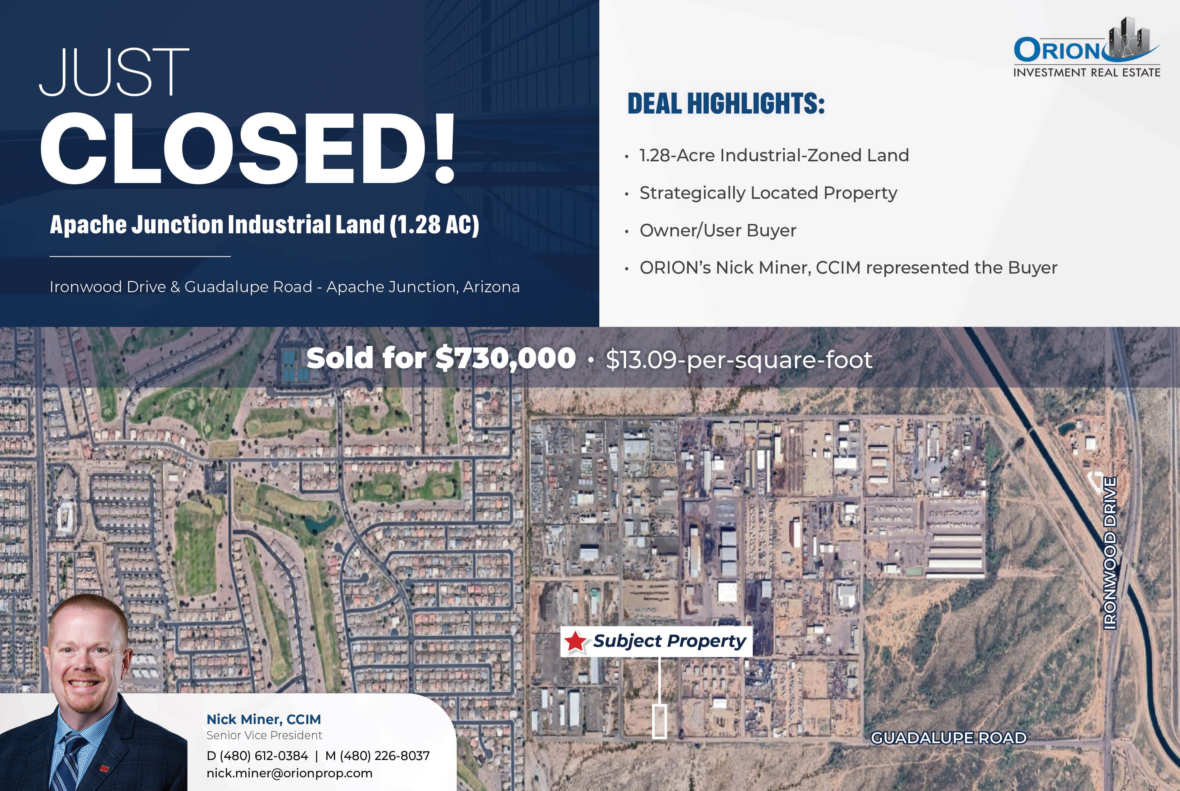 APACHE JUNCTION, AZ – ORION Investment Real Estate’s Nick Miner, CCIM assists his client, New Legacy Development, LLC, in the successful purchase of a 1.28-acre industrial-zoned land parcel in Apache Junction, Arizona for $730,000.00 or $13.09 per Sq. Ft. The acquisition marks a significant step in the company’s expansion plans into the Phoenix Metro Market.